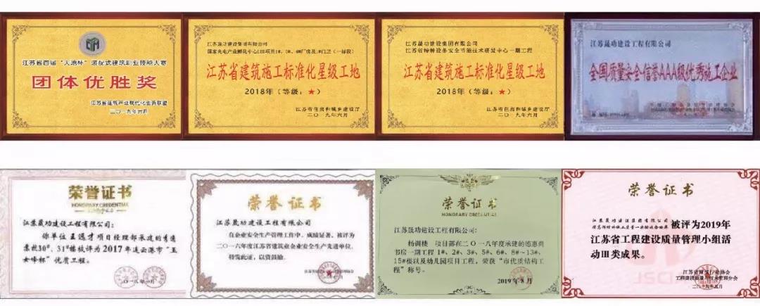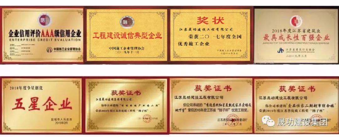 晟功建設(shè)集團(tuán)立足江蘇,面向全國(guó),已將業(yè)務(wù)延伸至安徽、浙江、遼寧、河南、甘肅、山東、新疆、黑龍江等省市,承建了一大批精品工程,相繼榮獲“揚(yáng)子杯”、“玉女峰杯”、“鹽阜杯”等百余項(xiàng)榮譽(yù)。晟功建設(shè)集團(tuán)憑借良好的誠(chéng)信口碑和高效卓越的運(yùn)營(yíng)質(zhì)量,從無(wú)社會(huì)矛盾、經(jīng)濟(jì)糾紛、法律官司,連續(xù)多年在全省免交農(nóng)民工工資保證金,被評(píng)為“全國(guó)企業(yè)社會(huì)信用評(píng)價(jià)AAA級(jí)信用企業(yè)”、“全國(guó)優(yōu)秀施工企業(yè)”、“工程建設(shè)誠(chéng)信典型企業(yè)”、“江蘇省最具成長(zhǎng)性百?gòu)?qiáng)企業(yè)”、“鹽城市建筑業(yè)發(fā)展工作先進(jìn)企業(yè)”,連續(xù)3年獲得鹽城市“星級(jí)企業(yè)”。2019年在南京舉辦的江蘇省“大地杯”裝配式建筑職業(yè)技能競(jìng)賽中,晟功建設(shè)集團(tuán)獲得了“團(tuán)體優(yōu)勝獎(jiǎng)”的好成績(jī)。