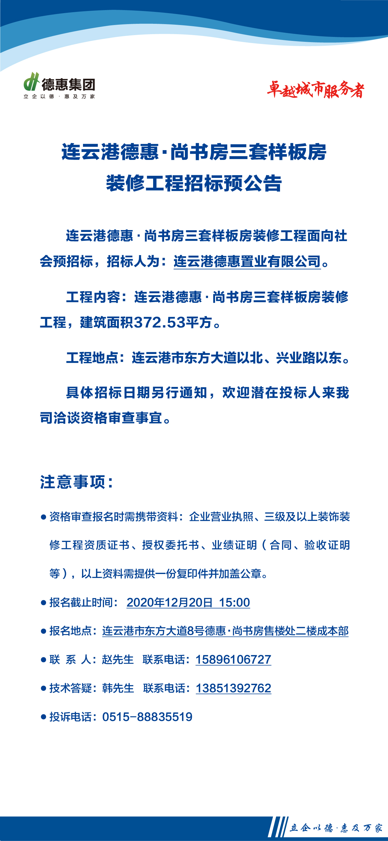 連云港德惠尚書房三套樣板房裝修工程招標(biāo)預(yù)公告