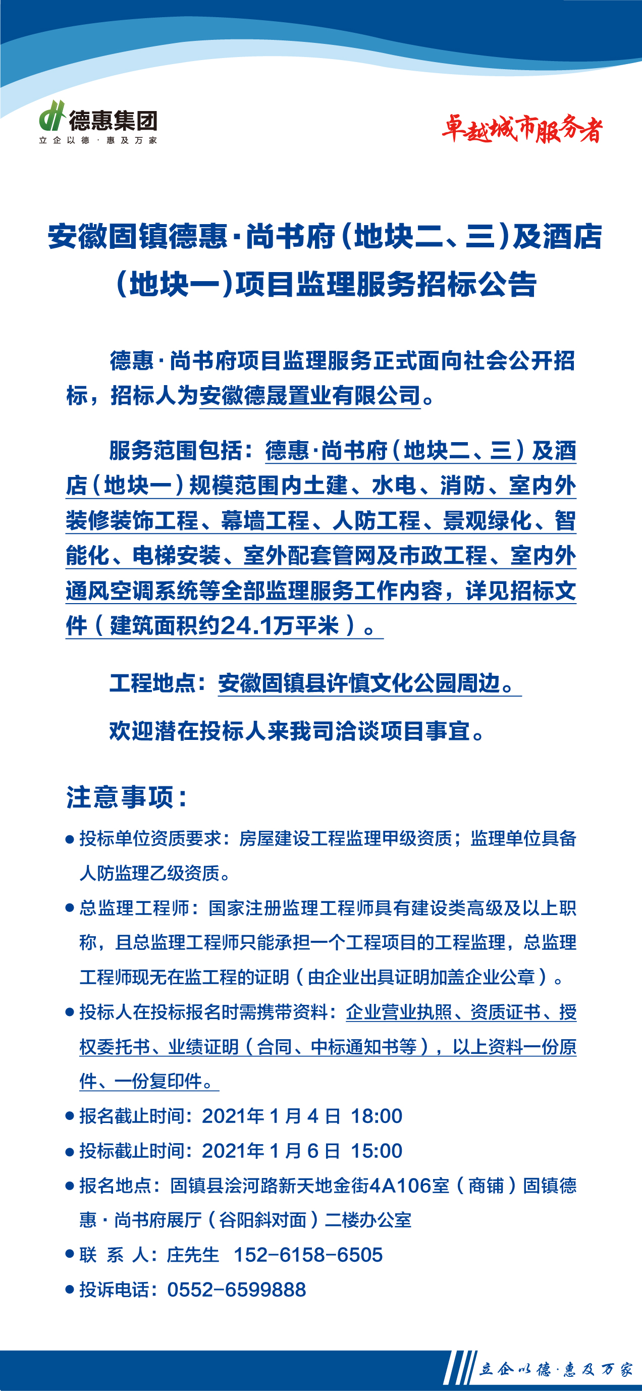 安徽固鎮(zhèn)德惠·尚書府(地塊二、三)及酒店(地塊一)監(jiān)理服務項目招標公告