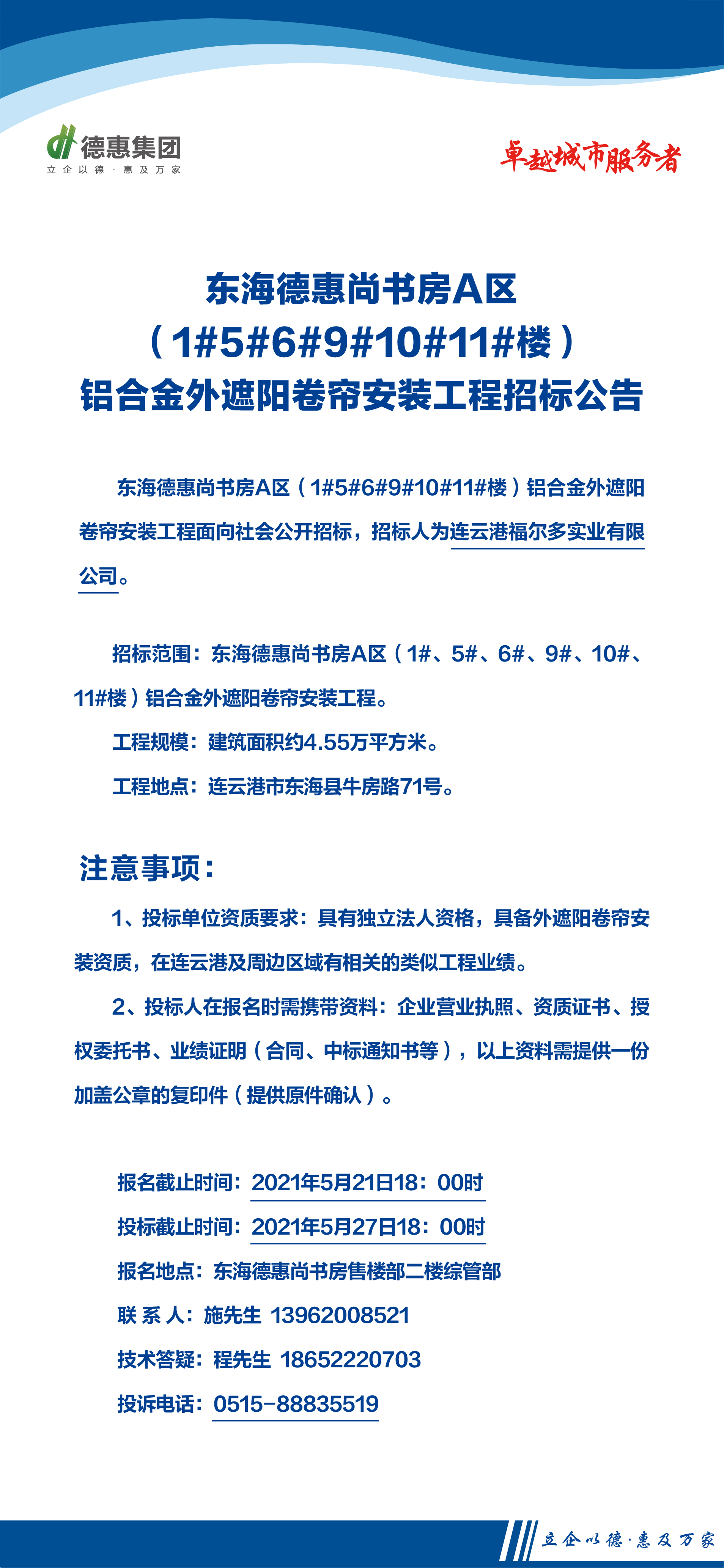 東海德惠尚書房小學(xué)、幼兒園欄桿雨棚工程、A區(qū)(1#5#6#9#10#11#樓)鋁合金外遮陽(yáng)卷簾安裝工