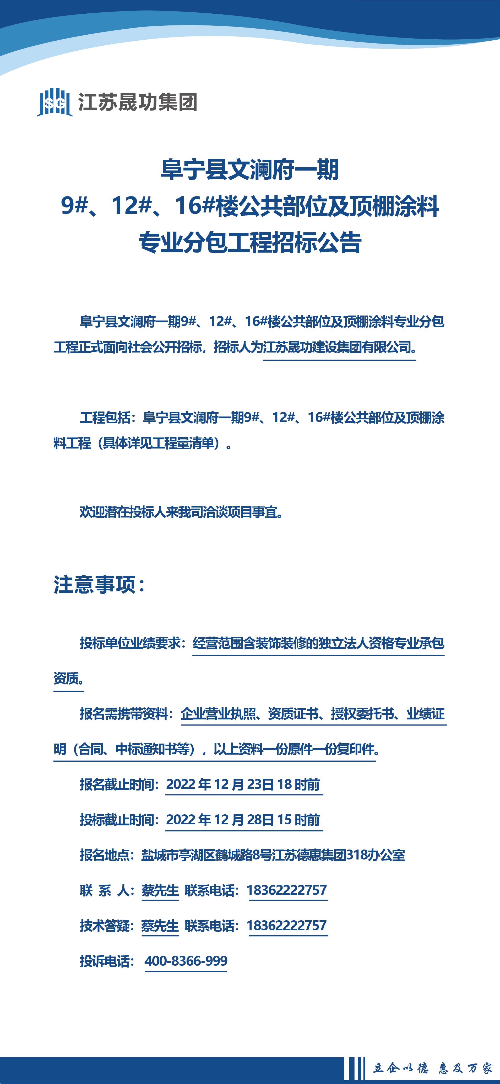 阜寧縣文瀾府一期9#、12#、16#樓公共部位及頂棚涂料專業(yè)分包工程