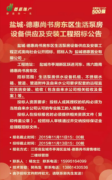 鹽城德惠尚書房東區(qū)生活泵房設(shè)備供應(yīng)及安裝工程招標(biāo)公告