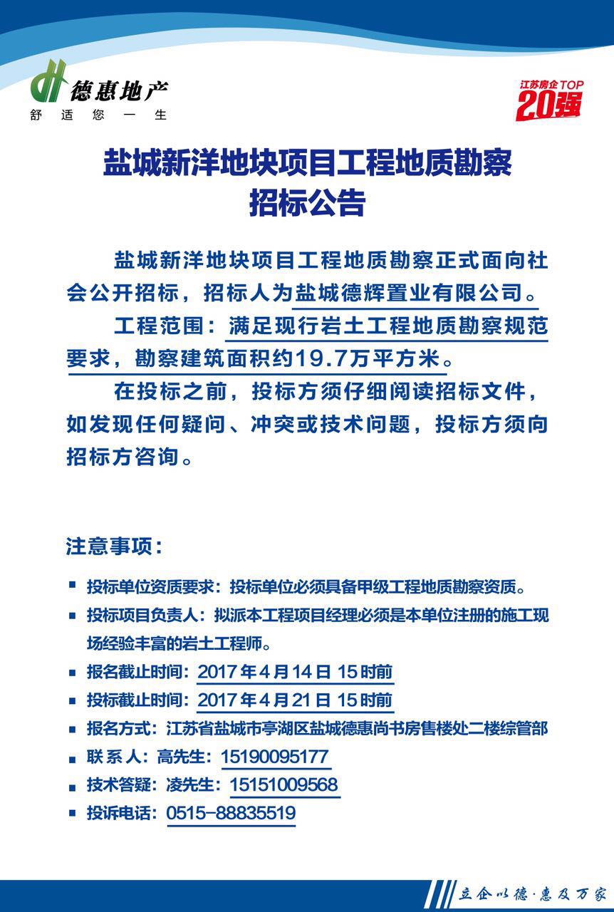 鹽城新洋地塊項(xiàng)目工程地質(zhì)勘察招標(biāo)公告
