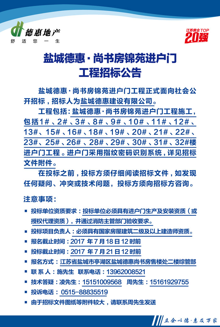 鹽城德惠•尚書房錦苑進(jìn)戶門工程招標(biāo)公告