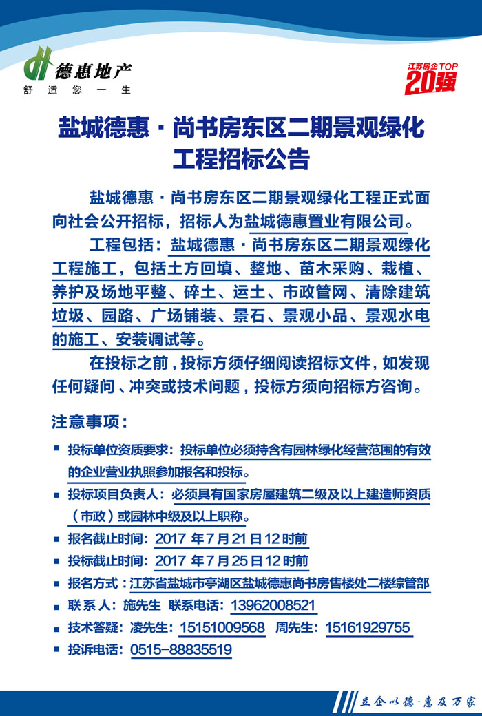 鹽城德惠·尚書房東區(qū)二期景觀綠化工程招標公告