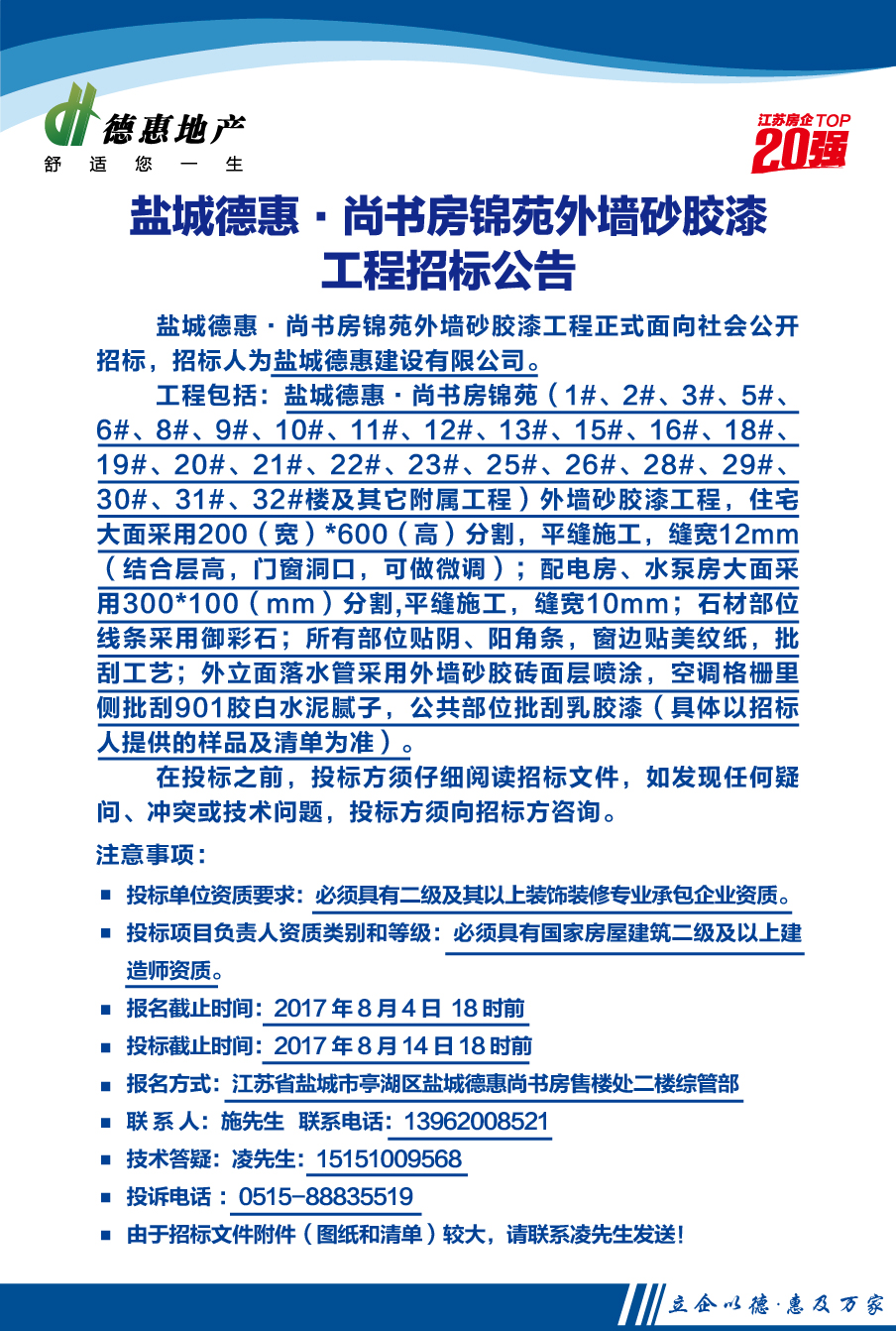 鹽城德惠•尚書房錦苑外墻砂膠漆工程招標(biāo)公告