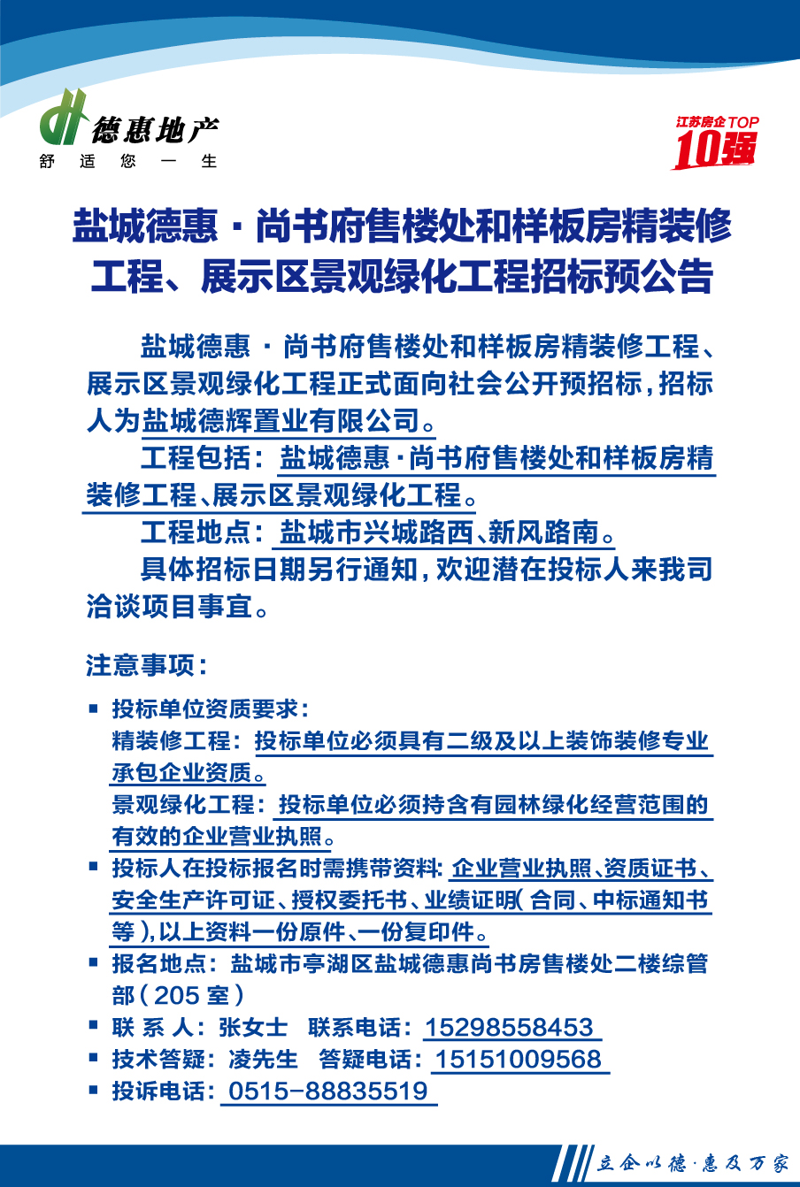 鹽城德惠·尚書府售樓處和樣板房精裝修工程、展示區(qū)景觀綠化工程招標預(yù)公告