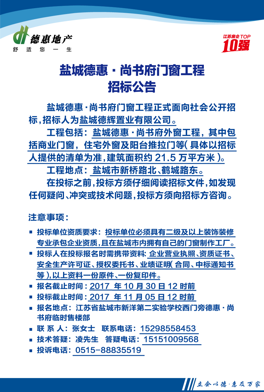 鹽城德惠·尚書府門窗工程招標(biāo)公告