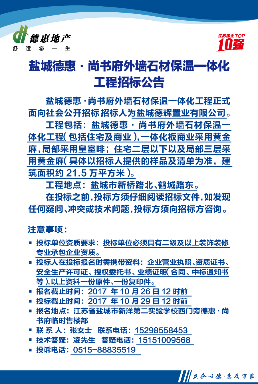 鹽城德惠·尚書府外墻石材保溫一體化工程招標(biāo)公告