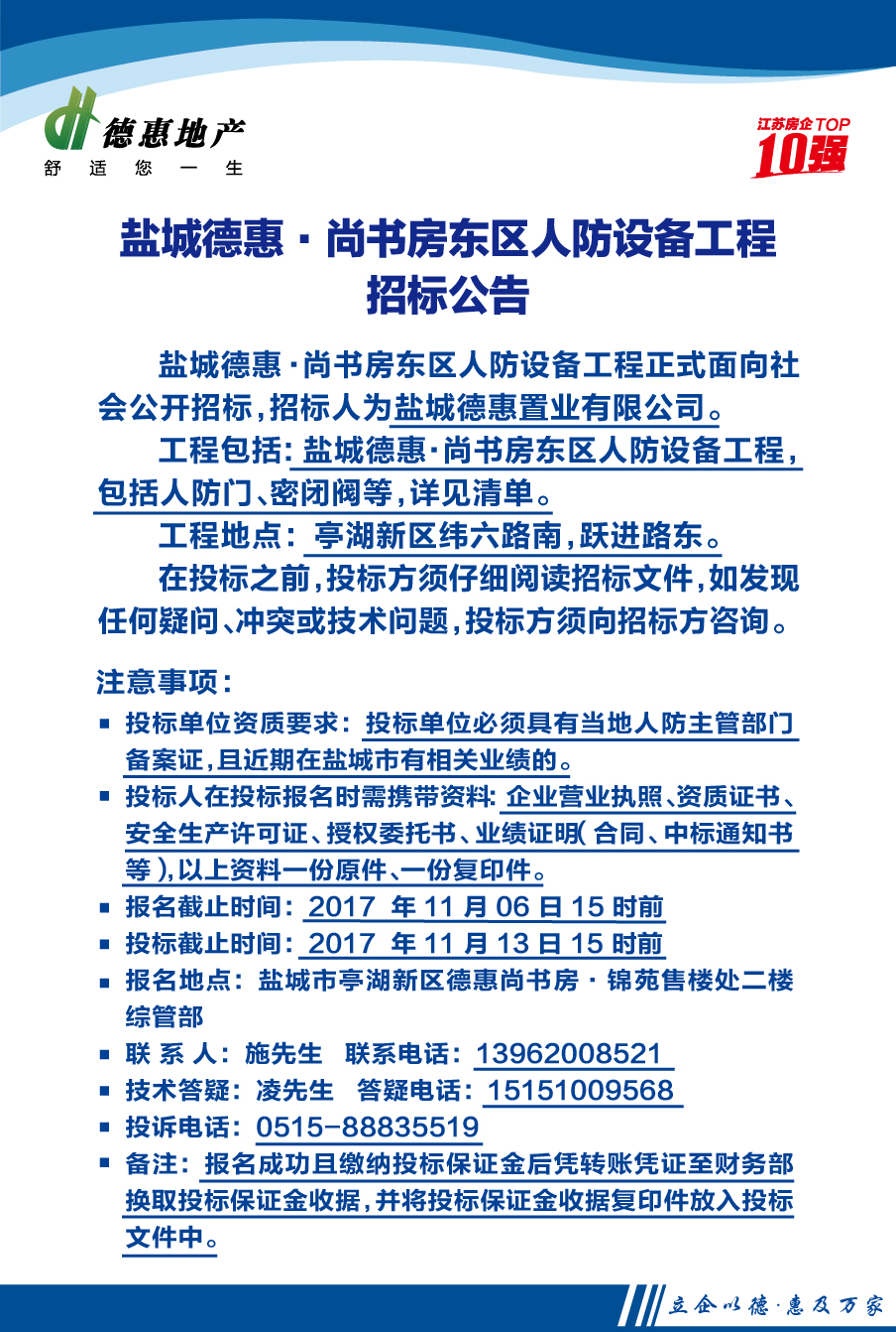 鹽城德惠·尚書房東區(qū)人防設備工程招標公告