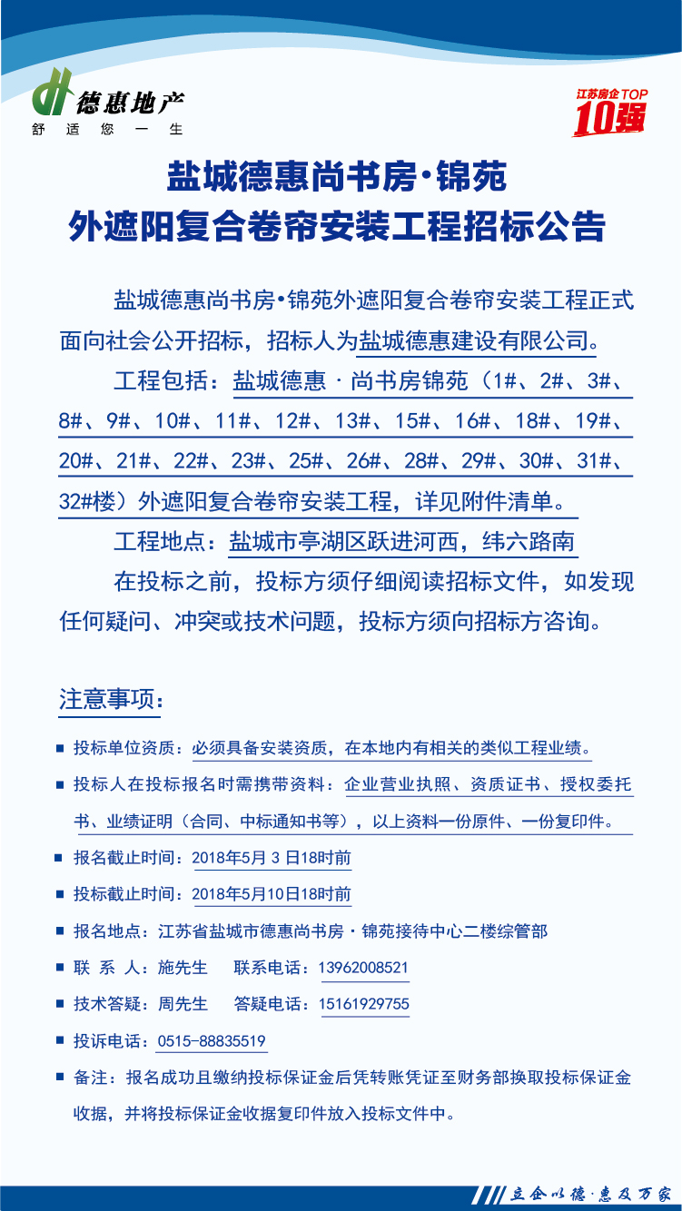 鹽城德惠尚書房·錦苑外遮陽復(fù)合卷簾安裝工程招標(biāo)公告