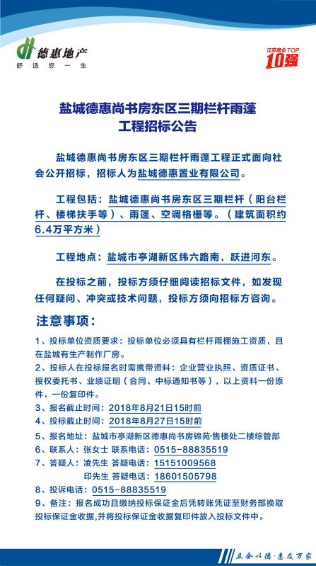 鹽城德惠尚書房東區(qū)三期欄桿雨蓬工程招標(biāo)公告