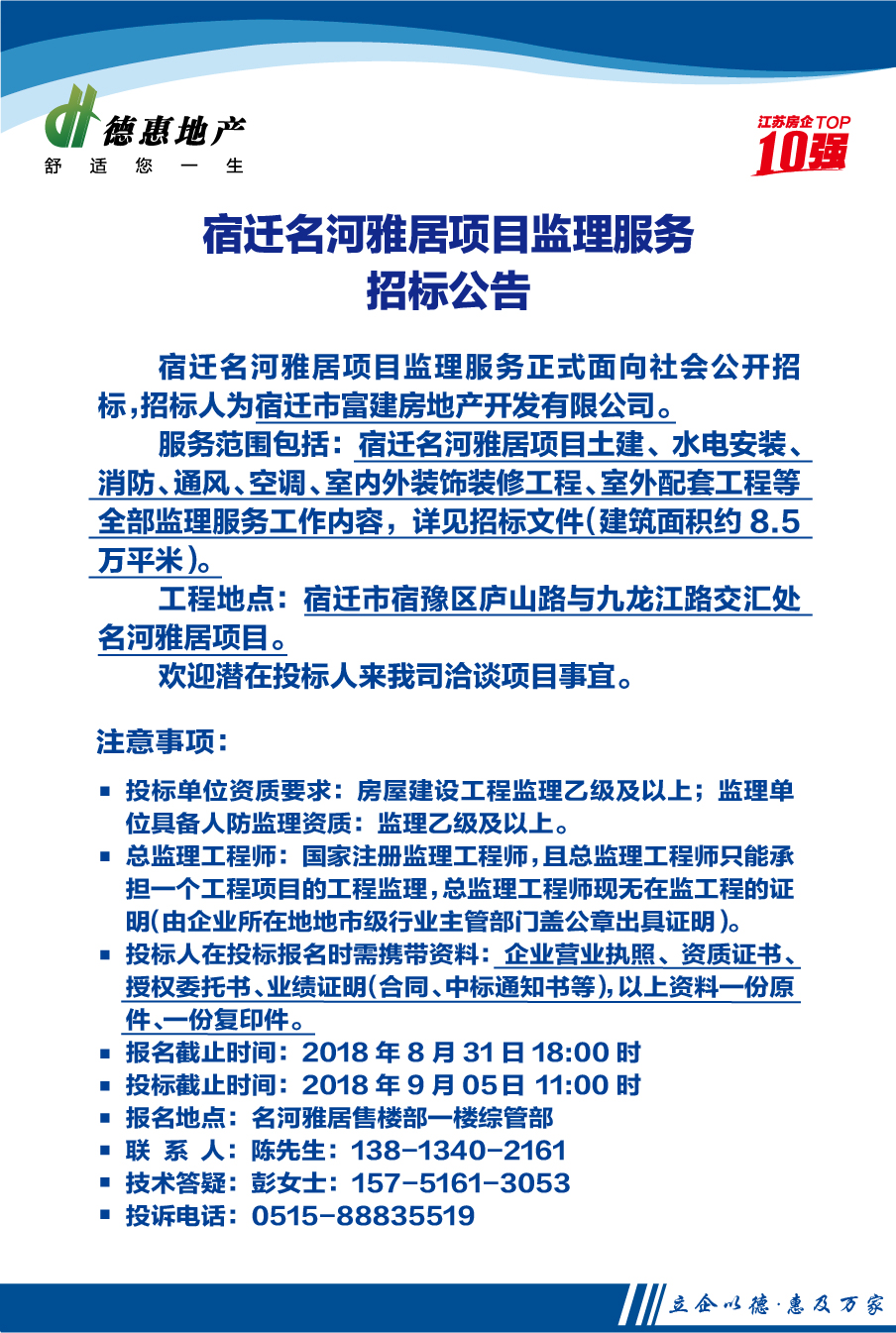 宿遷名河雅居項目監(jiān)理服務招標公告