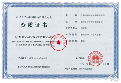 2014年8月25日,江蘇德惠建設(shè)集團(tuán)有限公司榮升全國房地產(chǎn)開發(fā)一級資質(zhì) |