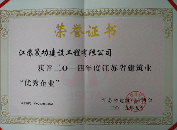 2015年7月19日,從鹽城市建筑業(yè)協(xié)會五屆二次會長辦公會議傳來好消息:江蘇晟功建設(shè)工程有限公司榮獲“二〇一四年度江蘇省建筑業(yè)優(yōu)秀企業(yè)”稱號,朱文亮同志獲評“二〇一四年度江蘇省建筑業(yè)優(yōu)秀企業(yè)經(jīng)理”。