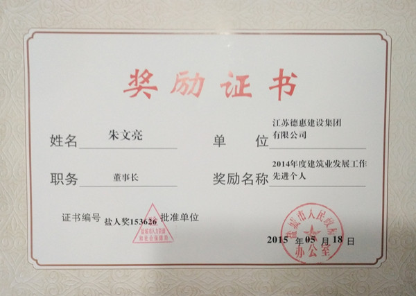 2016年1月7日,朱文亮董事長(zhǎng)榮獲“2014年度建筑業(yè)發(fā)展工作先進(jìn)個(gè)人”稱號(hào)! |