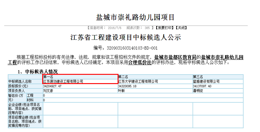 2016年7月6日,鹽城市鹽都區(qū)教育局的鹽城市崇禮路幼兒園項(xiàng)目中標(biāo)候選人公示,江蘇晟功建設(shè)工程有限公司以99.33分的成績(jī)位列第一名,7月12日中標(biāo)公示結(jié)果公布,晟功公司成功中標(biāo)。 本項(xiàng)目共計(jì)49家企業(yè)參與投標(biāo),經(jīng)過(guò)激烈競(jìng)標(biāo),晟功公司憑借優(yōu)質(zhì)的品牌信用、成熟的施工經(jīng)驗(yàn)、高效的質(zhì)量進(jìn)度保證體系及合理的報(bào)價(jià)贏得了招標(biāo)單位的青睞,并順利中標(biāo)。 此次中標(biāo)標(biāo)志著晟功公司在開(kāi)拓市場(chǎng)的道路上又前進(jìn)了一步,晟功公司將繼續(xù)朝著蘇北龍頭企業(yè)的堅(jiān)定目標(biāo)而努力奮斗。 |