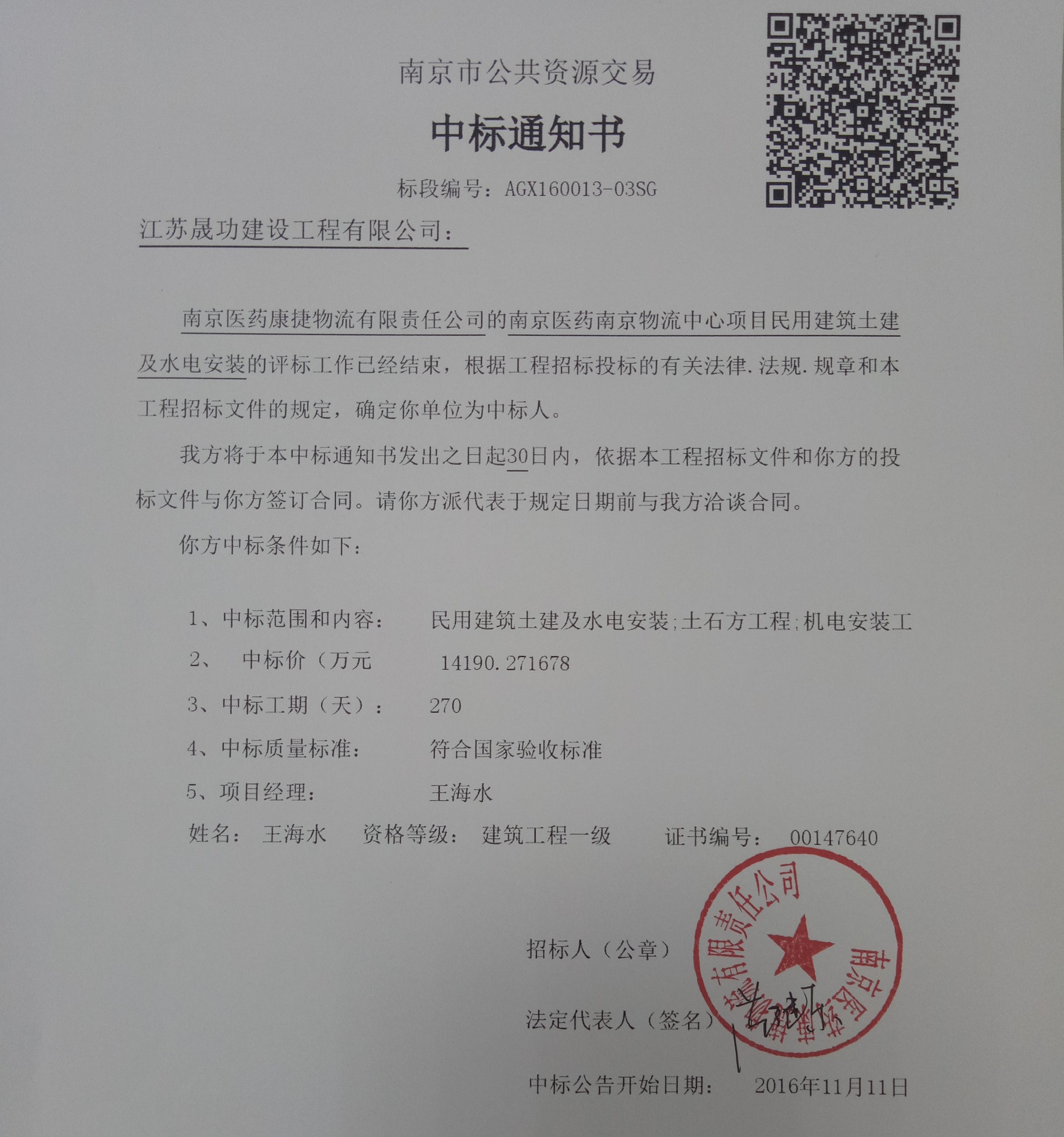 喜賀晟功建設(shè)中標南京醫(yī)藥南京物流中心項目 |