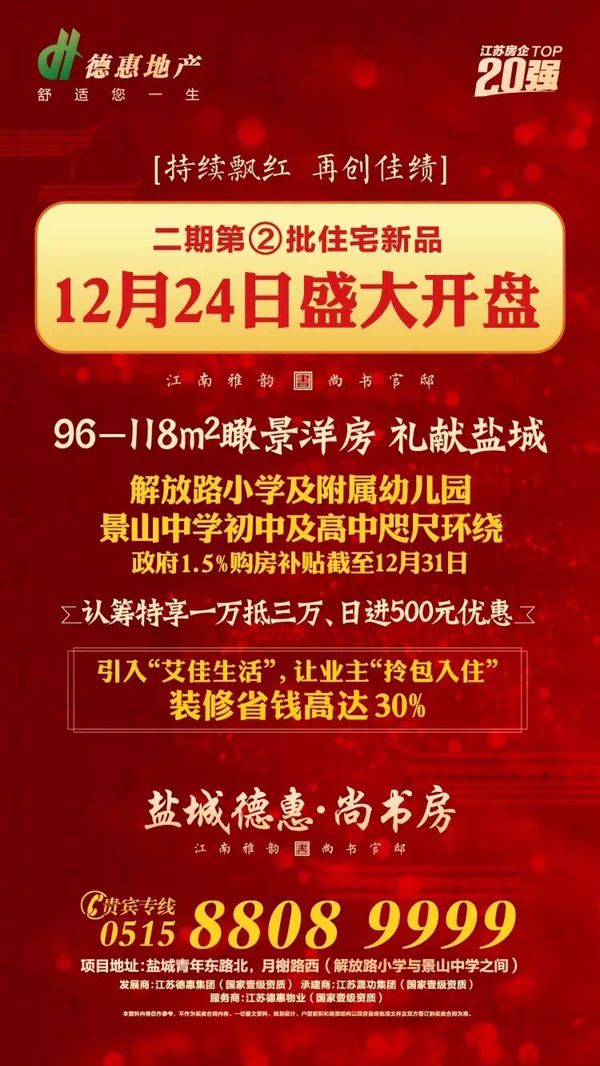 項(xiàng)目過硬的建筑品質(zhì)先后獲得省市各級政府部門的嘉獎。2016年2月,鹽城德惠尚書房項(xiàng)目榮獲鹽城市亭湖區(qū)人民政府頒發(fā)的建筑業(yè)工作“創(chuàng)省級標(biāo)準(zhǔn)化示范工地”獎項(xiàng)。2016年8月,德惠集團(tuán)晟功建設(shè)與400多家強(qiáng)勁的對手企業(yè)激烈角逐評比后,位列鹽城市建筑企業(yè)信用評價前四強(qiáng)! 德惠集團(tuán)全體人員未來將再接再厲,持續(xù)狠抓現(xiàn)場文明施工,以優(yōu)質(zhì)的質(zhì)量管理、先進(jìn)的施工技術(shù)為保障,為鹽城父老鄉(xiāng)親打造更多精品之家。 新品開盤在即,火爆認(rèn)籌中 為回饋家鄉(xiāng)父老的厚愛,鹽城德惠·尚書房二期第二批住宅新品將于 12月24日盛大開盤,現(xiàn)正火爆認(rèn)籌中,誠邀父老鄉(xiāng)親蒞臨品鑒!