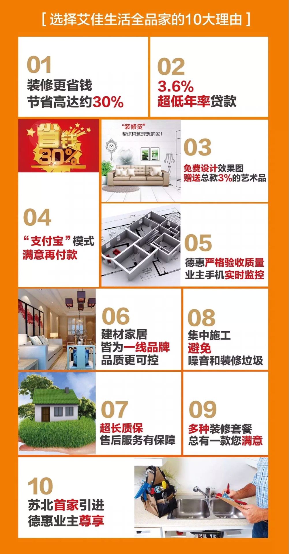 為了解決業(yè)主裝修過程中的“煩、痛、累”,有效降低裝修費(fèi)用,江蘇德惠集團(tuán)特將“艾佳生活”首家引入蘇北,助力“城市服務(wù)商”戰(zhàn)略再升級(jí),為業(yè)主帶來“省錢、省力、省心”的全新裝修和生活方式! 艾佳生活采用“定制化+個(gè)性化”家裝模式,與全國(guó)數(shù)十家一線知名房企戰(zhàn)略合作,直接向品牌家具建材廠商規(guī)?;少彛挥善放萍已b公司流水化施工,大大降低裝修成本。讓業(yè)主在裝修省錢達(dá)30%的基礎(chǔ)上,實(shí)現(xiàn)“拎包入住”的夢(mèng)想。