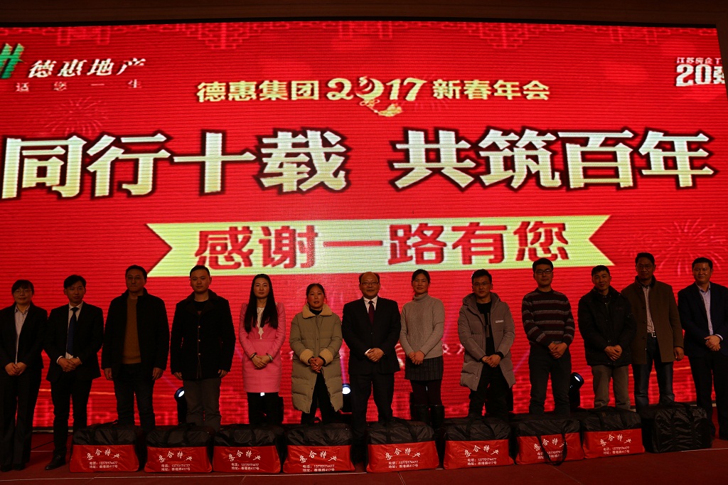 2017年1月21日,江蘇德惠集團(tuán)“同行十載,共筑百年——感謝一路有您”新春年會(huì)在天鵝湖國際大酒店盛大舉辦。當(dāng)晚蒞臨現(xiàn)場的嘉賓有江蘇德實(shí)投資發(fā)展有限公司張二干董事長一行,興業(yè)建工集團(tuán)有限公司伍迎國董事長一行,阜寧建筑設(shè)計(jì)院倪朝陽院長,蘇州六度設(shè)計(jì)院蔣光中院長一行,日升昌生物技術(shù)公司馬興旺董事長一行,江蘇眾拓建材有限公司瞿學(xué)松董事長一行,以及其他特邀嘉賓,優(yōu)秀經(jīng)紀(jì)人代表、老帶新代表,物管會(huì)成員和優(yōu)秀業(yè)主代表,德惠集團(tuán)員工家屬代表、優(yōu)秀學(xué)子代表等,與集團(tuán)員工代表共計(jì)500余人一起用掌聲、笑聲、歡呼聲迎接新年的到來 。