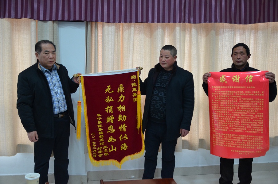 2017年2月3日下午,阜寧縣陳集鎮(zhèn)郝周村黨支部周書記及村委會董會計一行將“鼎力相助情四海,無私捐贈恩如山”的錦旗和一封數(shù)百字的感謝信送到了江蘇德惠集團(tuán),言辭之中流露出他們對德惠集團(tuán)朱文亮董事長及全體工會成員對郝周村夏德亮、夏延康父子倆援助之手表示感謝之情。