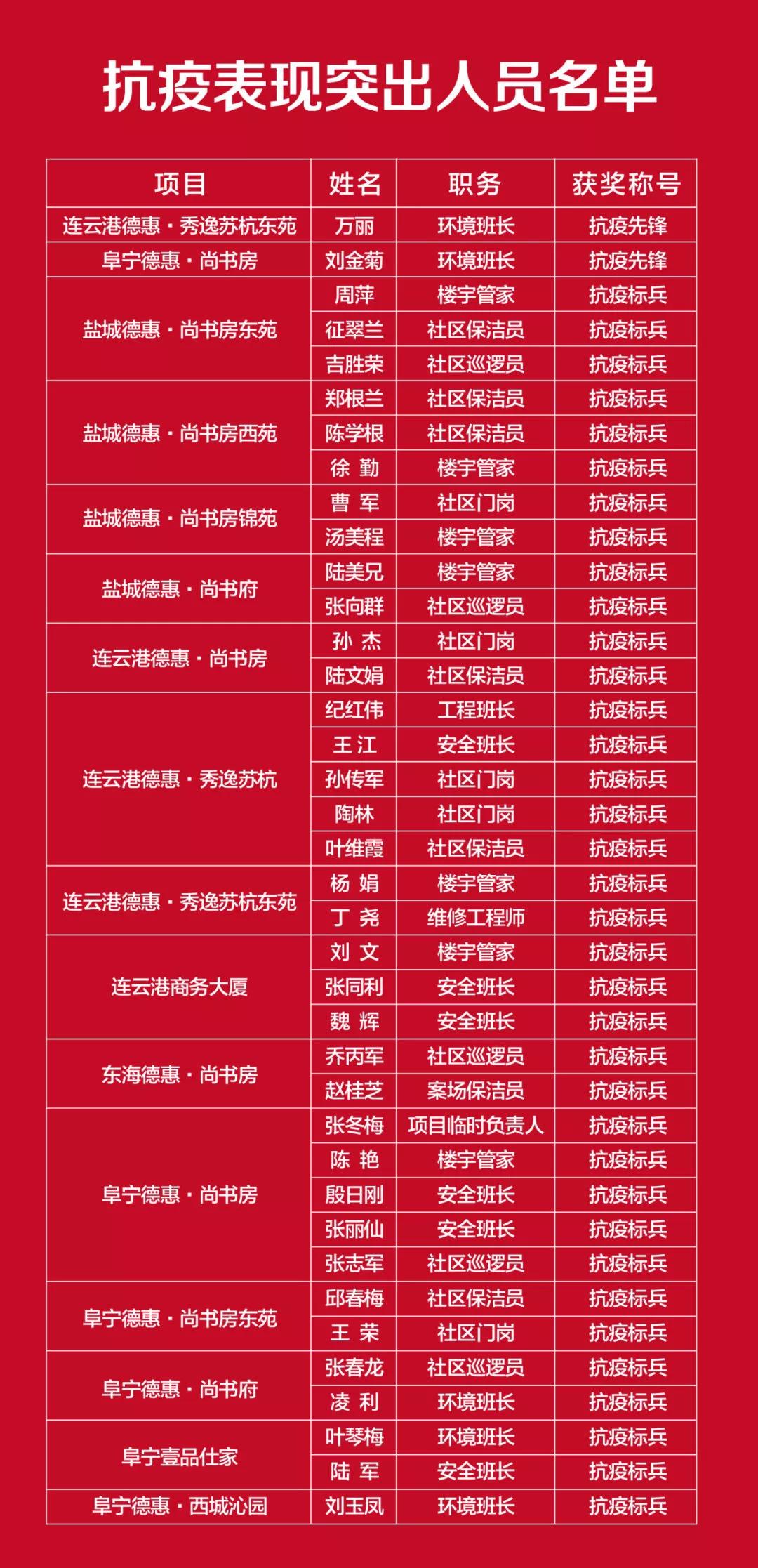 為更好地凝聚德惠物業(yè)及客服伙伴的力量,弘揚德惠物業(yè)及客服伙伴奮勇前行的精神,激發(fā)全體員工迎難而上、共克時艱的昂揚斗志,8月中旬德惠集團各區(qū)域項目召開了疫情防控表彰大會,通過各物業(yè)項目內部推薦及城運集團綜合評估,評定出在疫情期間表現(xiàn)突出的員工:“抗疫先鋒”2名,獎勵2000元/人;“抗疫標兵”共計36名,獎勵500元/人;同時對于2-3月份能堅守崗位的德惠物業(yè)及客服伙伴,發(fā)放特殊崗位津貼200元/人。 在此,德惠集團及全體伙伴,向你們在疫情期間的辛勤付出表示衷心的感謝,對你們的奉獻精神表示最崇高的敬意! 德惠集團以你們?yōu)轵湴?,向你們致敬?/span> 祝健康平安、闔家幸福! |