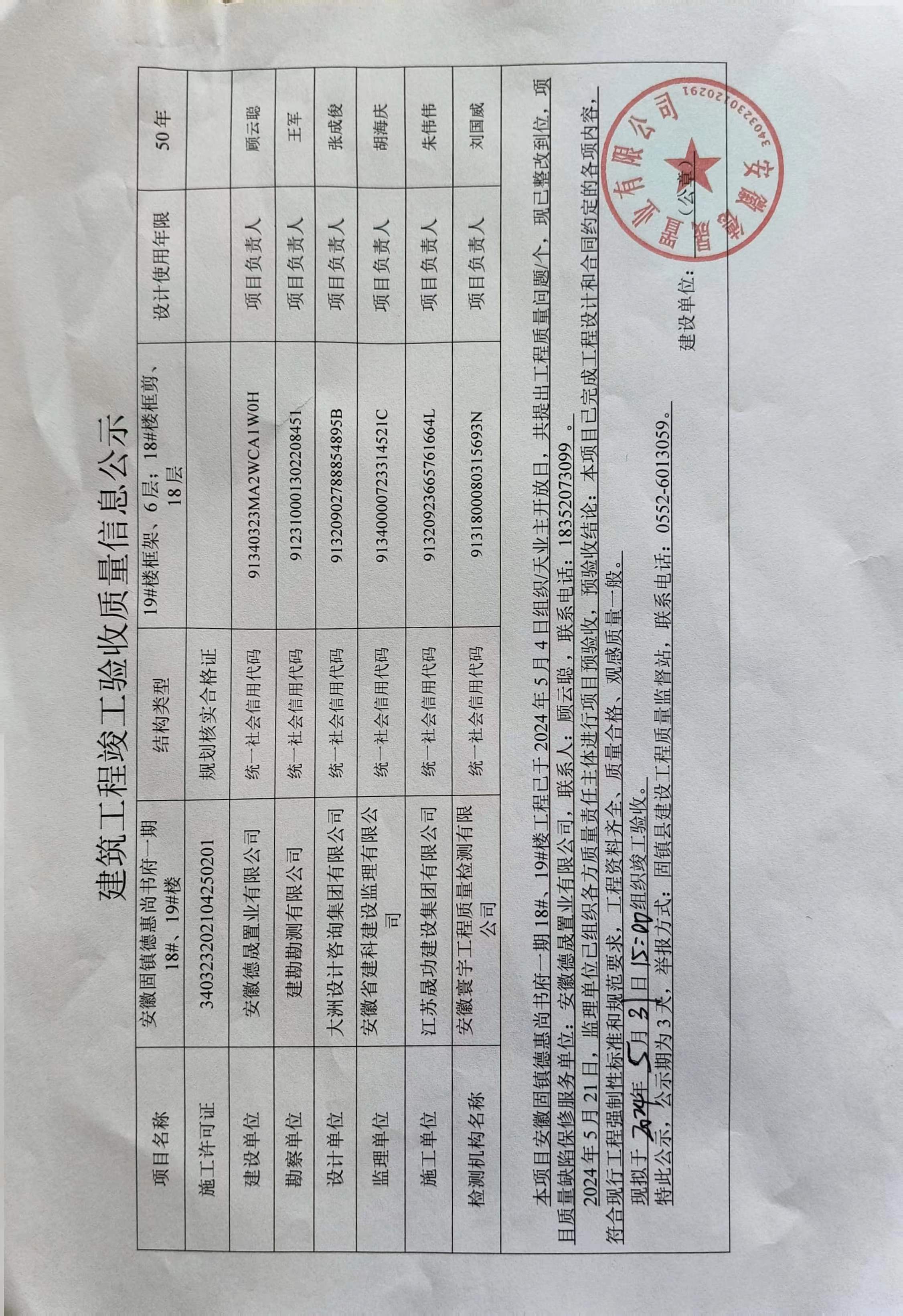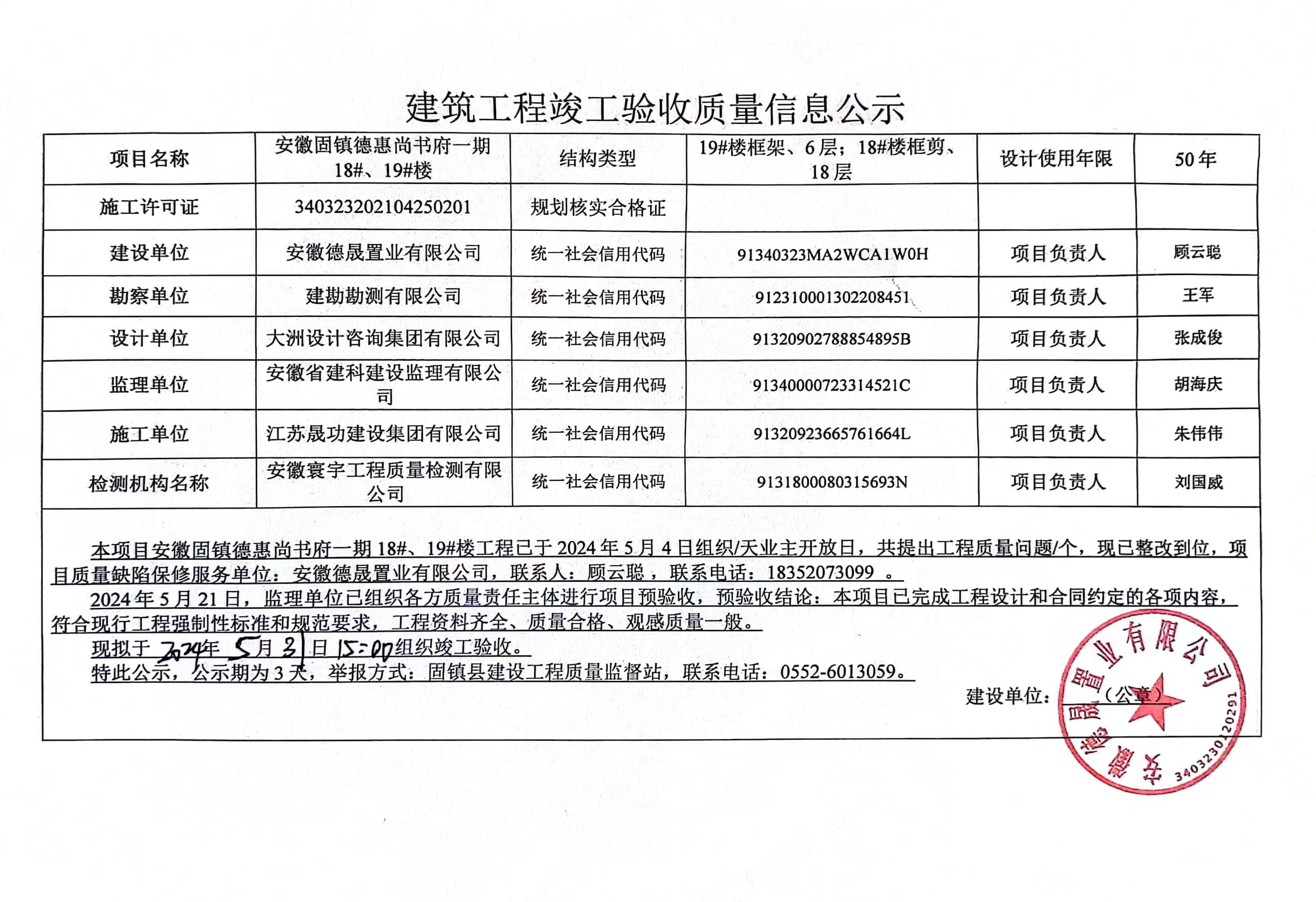 安徽固鎮(zhèn)德惠尚書(shū)府一期18#、19#樓建筑工程竣工驗(yàn)收質(zhì)量信息公示