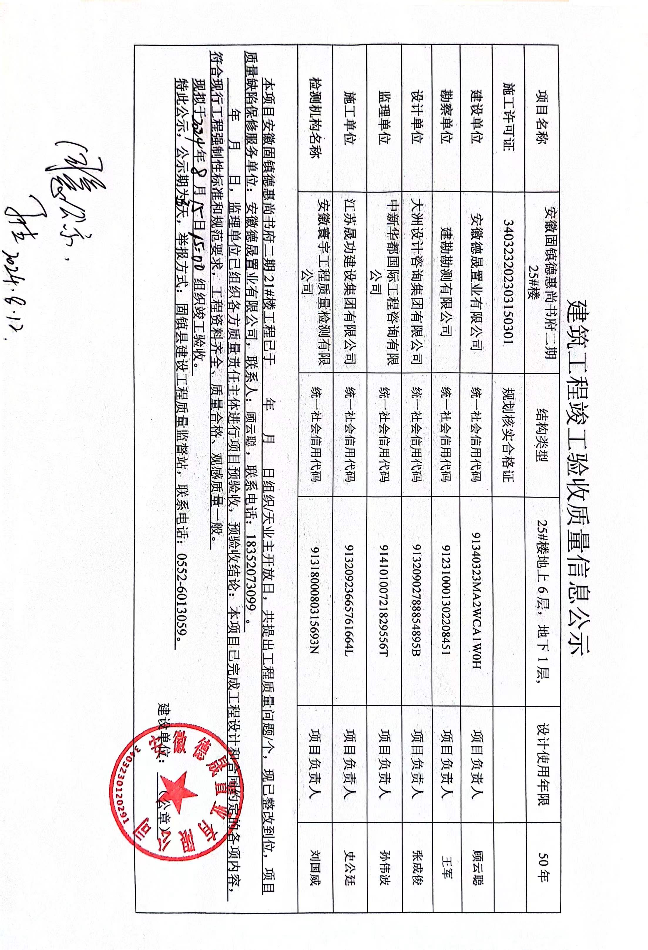 安徽固鎮(zhèn)德惠尚書府二期25#樓建筑工程竣工驗(yàn)收質(zhì)量信息公示